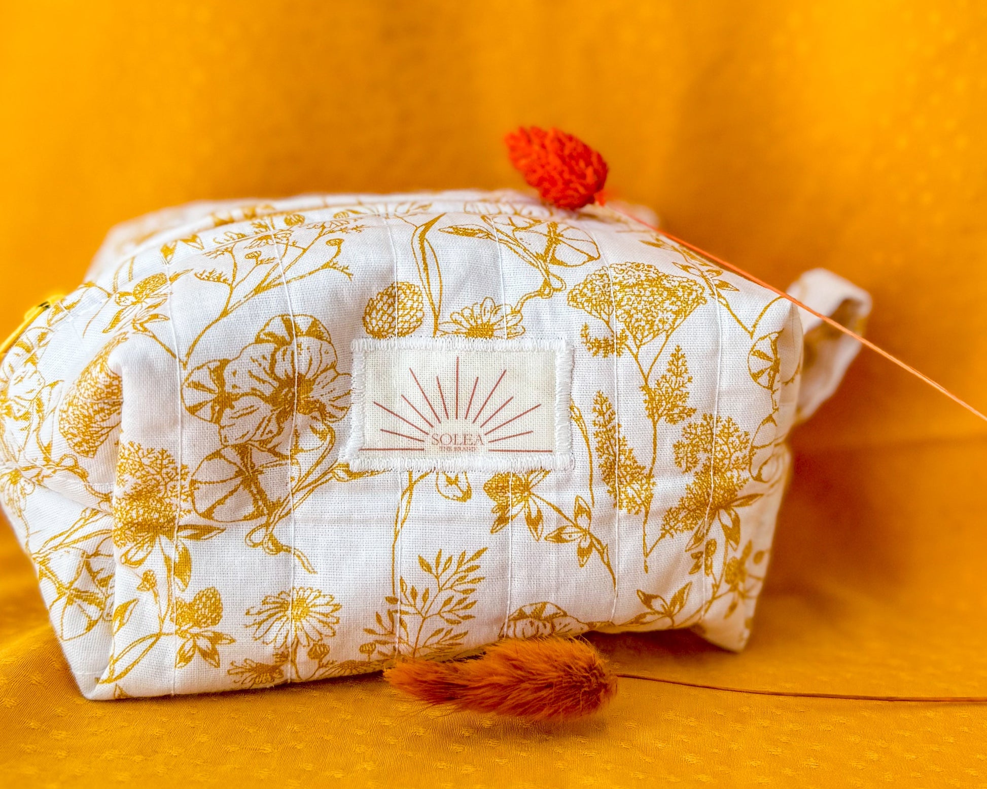 La trousse Botanica, en coton fleuri matelassé et cousue main, allie élégance et légèreté. Sa doublure inspirée du soleil apporte une touche lumineuse tout en protégeant soigneusement vos affaires. Compacte avec ses 15 cm, elle offre une organisation pratique et raffinée pour vos petits indispensables.